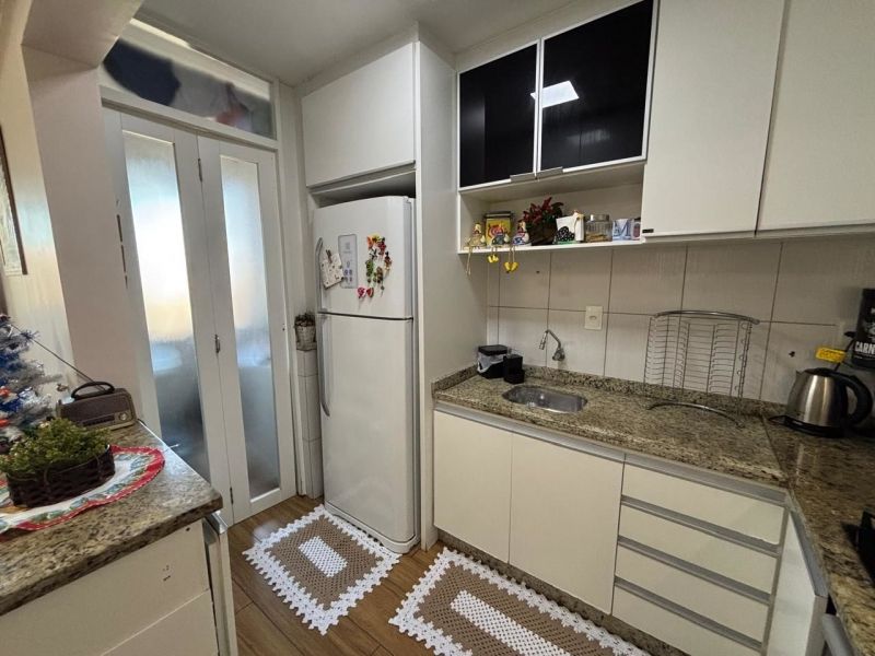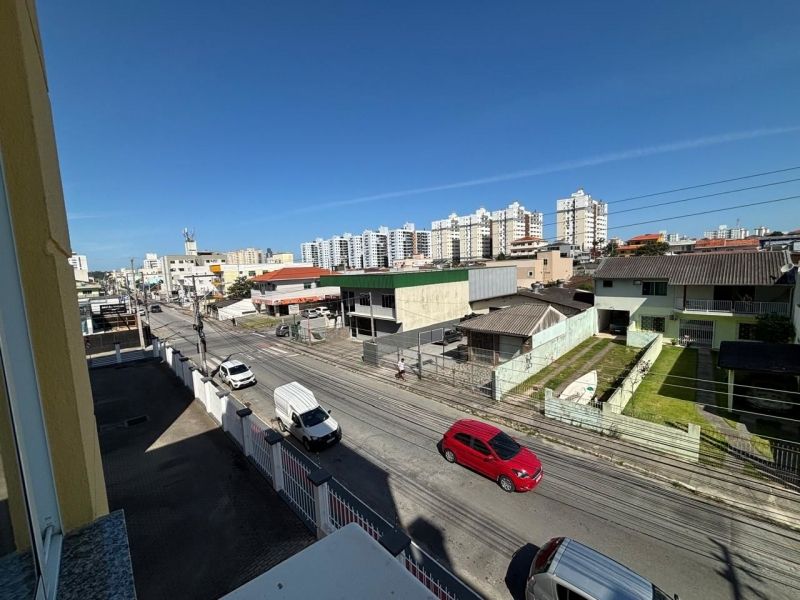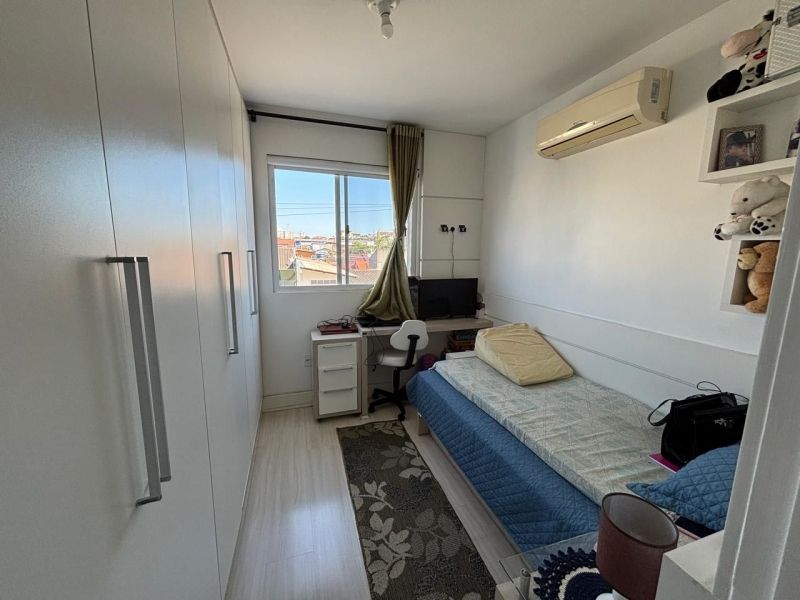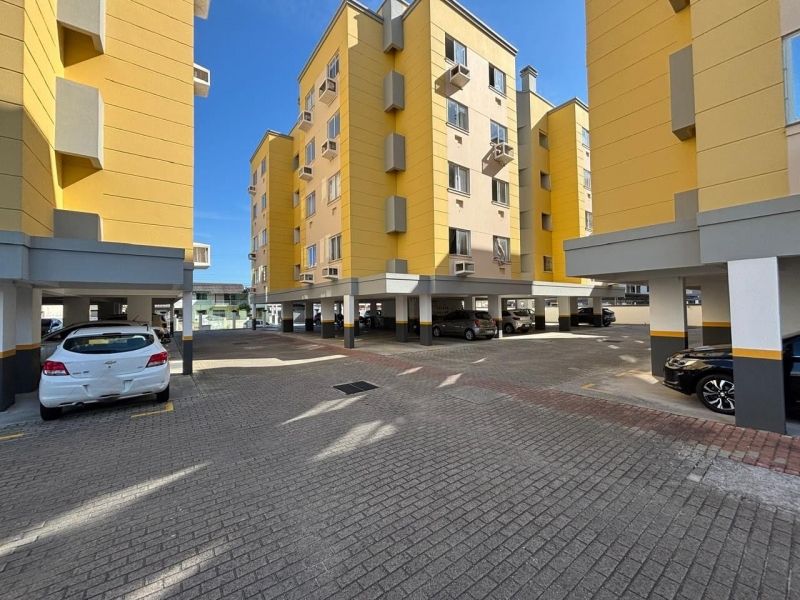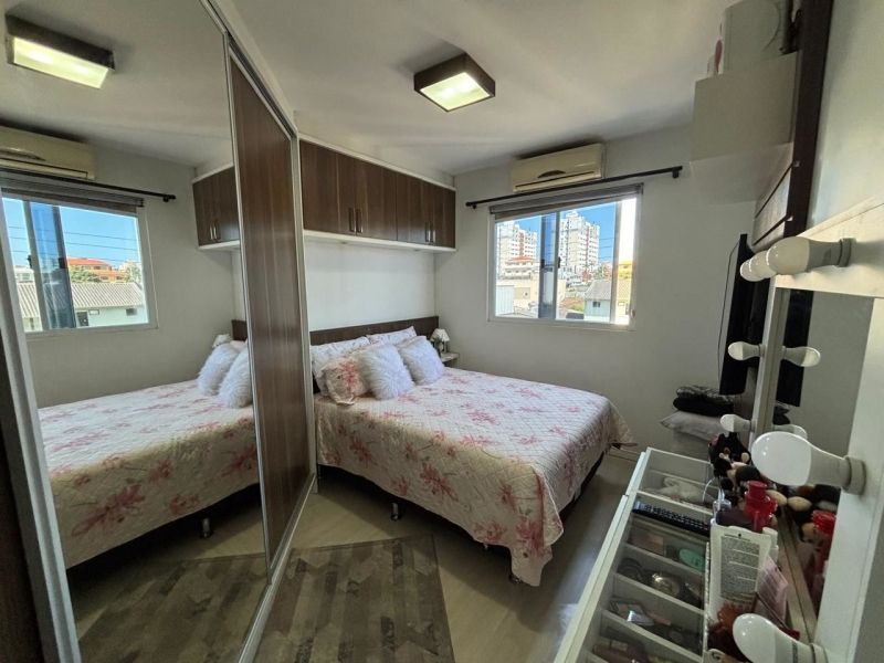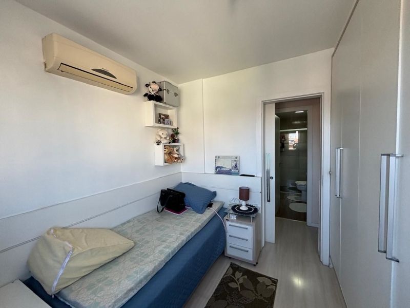 Apartamento no bairro Areias em São José com 2 dormitórios, banheiro social com ventilação natural, cozinha planejada, sala, sacada com churrasqueira, área de serviço planejada com balcão, acabamento em gesso e ar-condicionado nos cômodos.