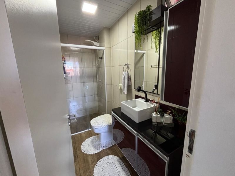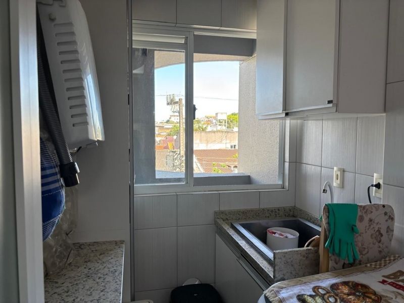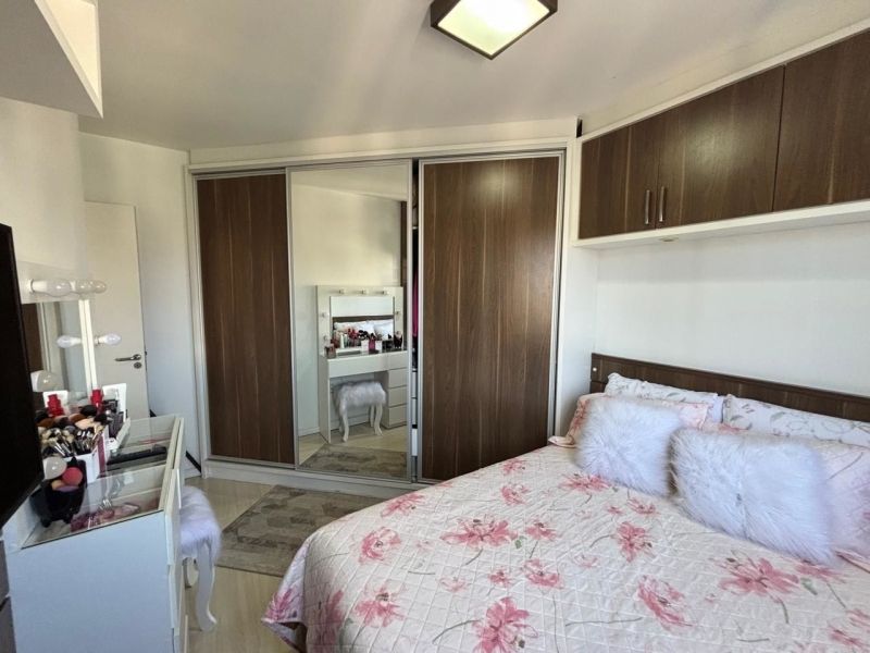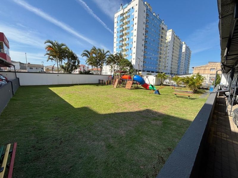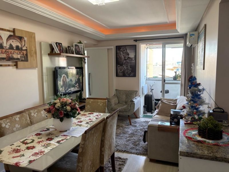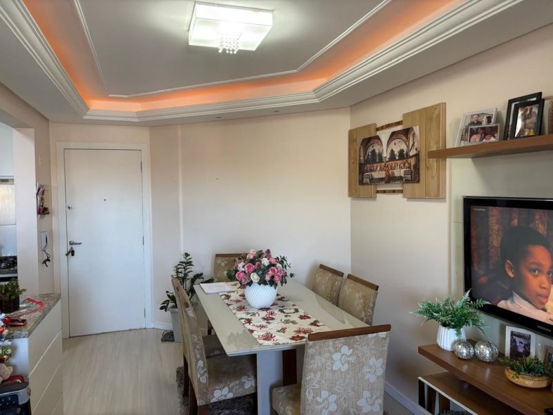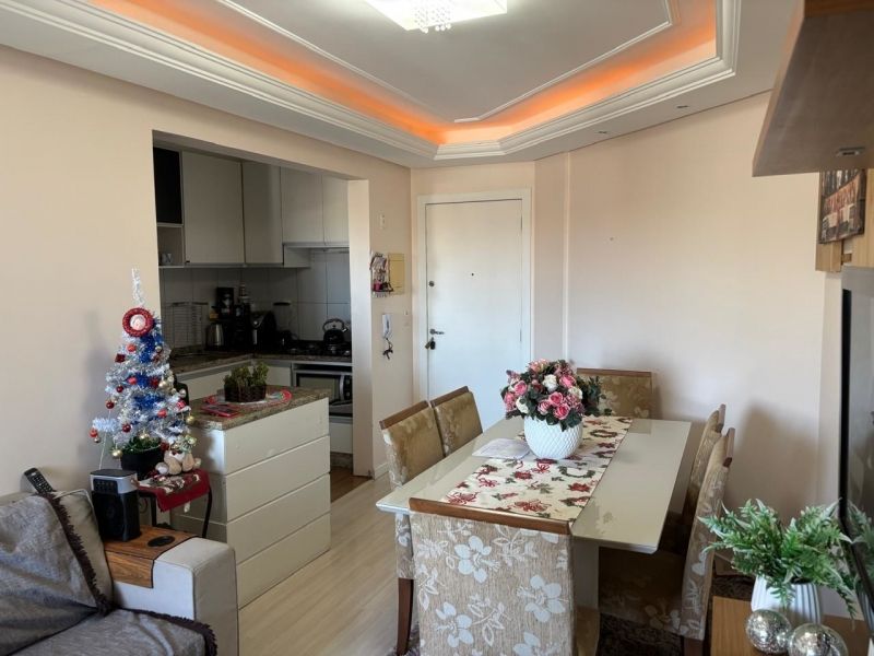 Apartamento no bairro Areias em São José com 2 dormitórios, banheiro social com ventilação natural, cozinha planejada, sala, sacada com churrasqueira, área de serviço planejada com balcão, acabamento em gesso e ar-condicionado nos cômodos.