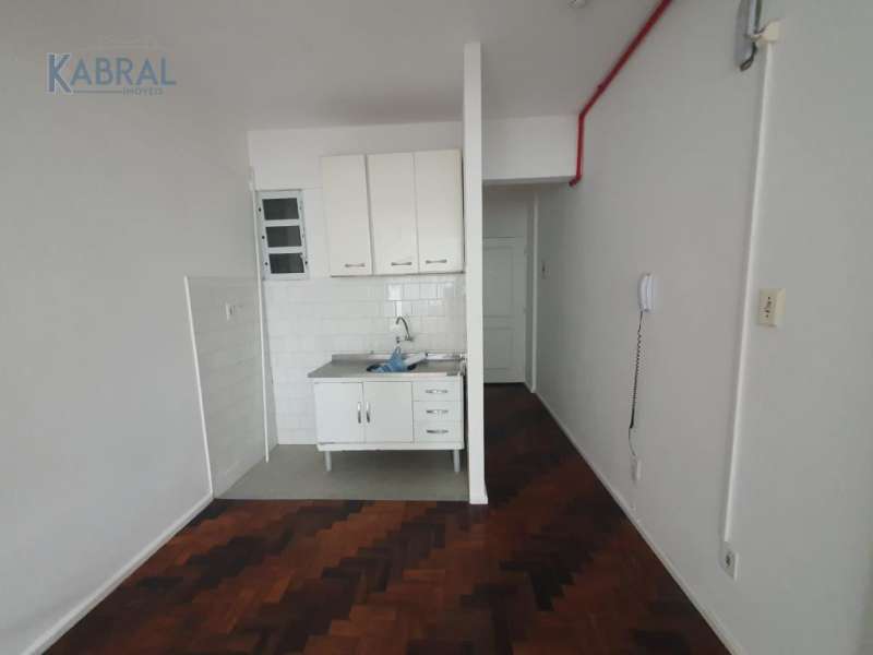 Kitnete com 1 banheiro e cozinha com armário.