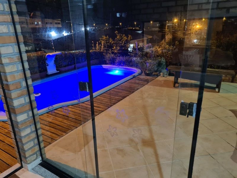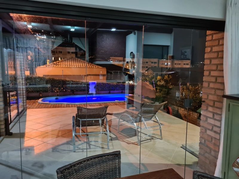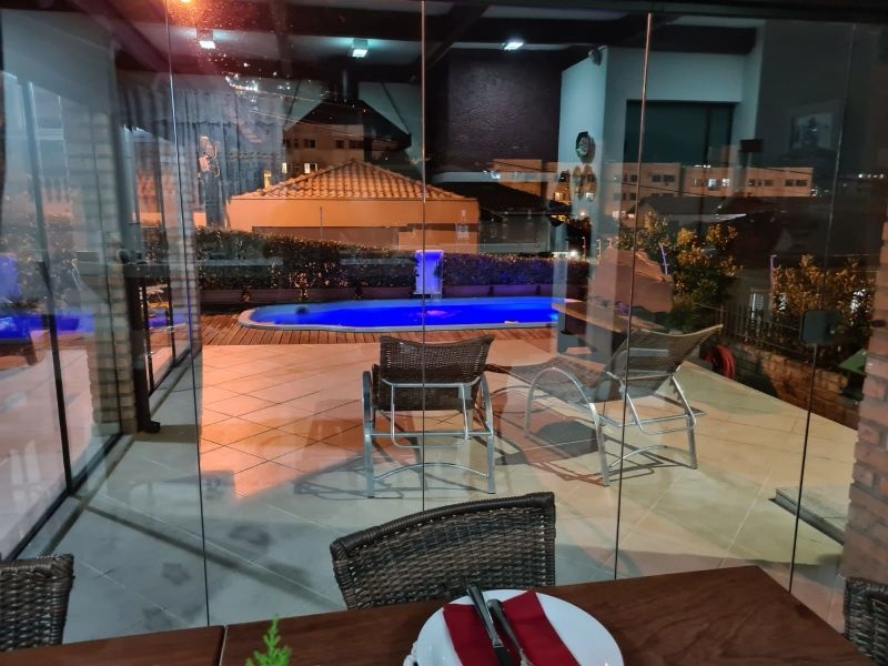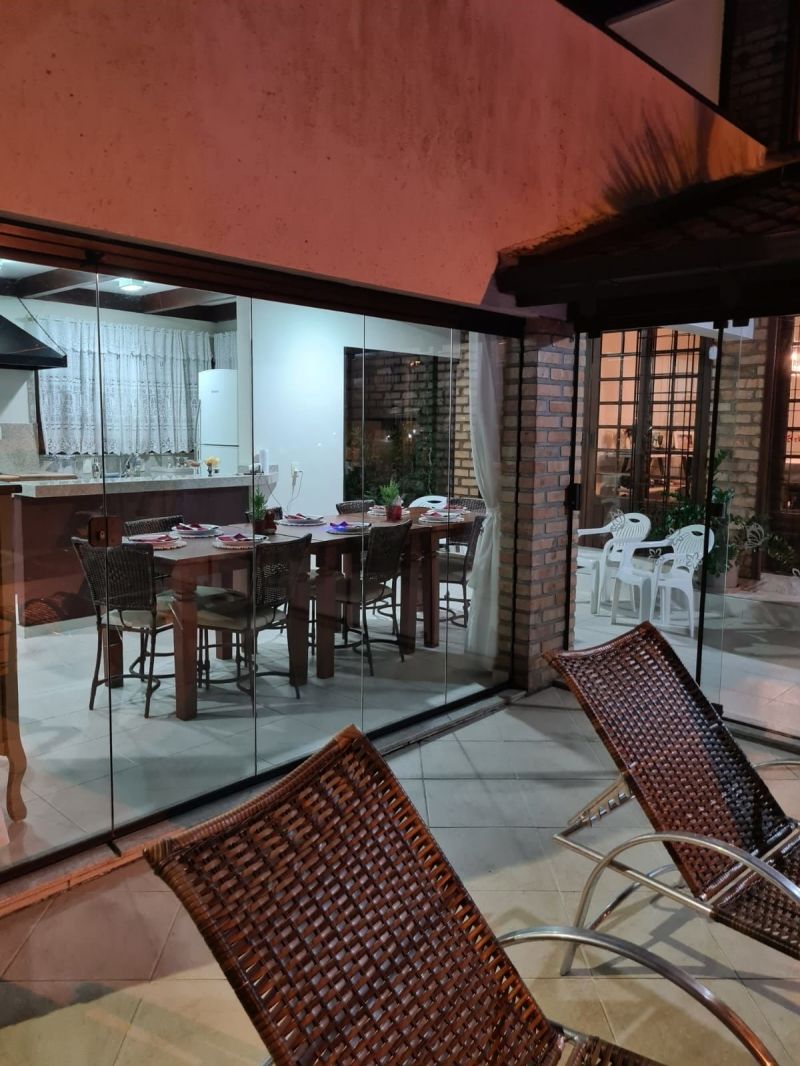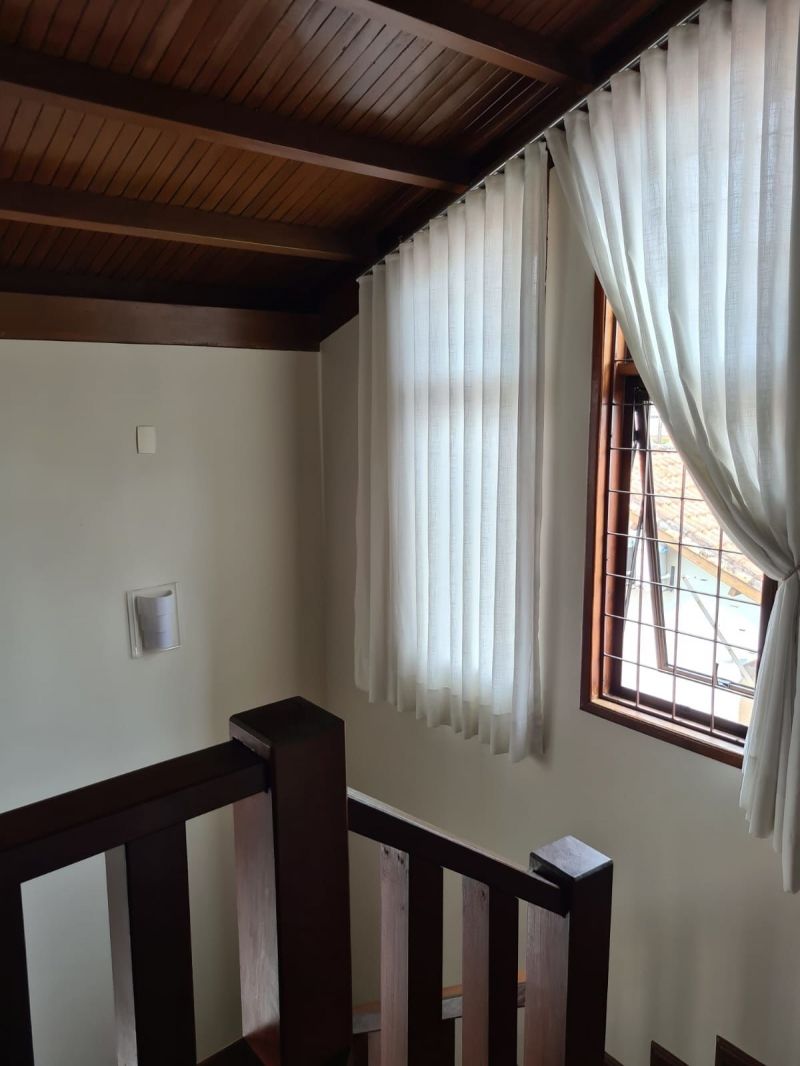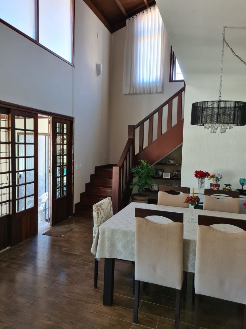 No térreo possui: 2 salas, espaço gourmet fechado em vidro de frente para piscina, cozinha, escada em madeira com corrimão para acessar segundo pavimento, churrasqueira, fogão a lenha, academia, banheiro, 2 vagas garagem coberta.