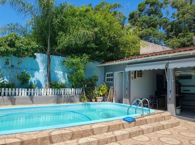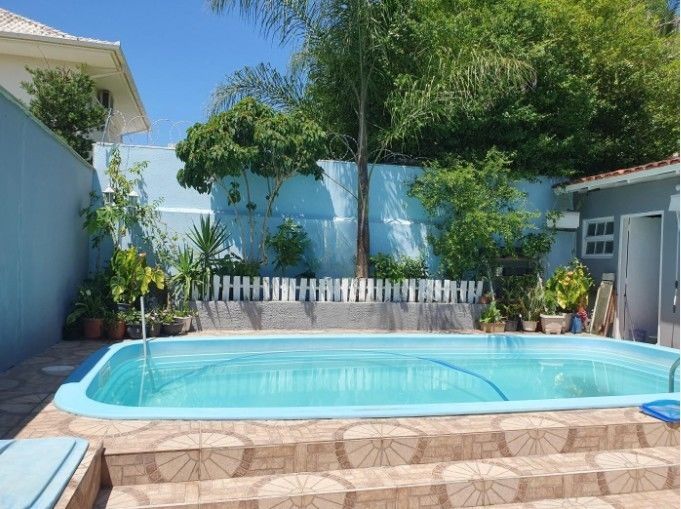 Área externa completa com piscina e churrasqueira, jardim, horta e ótima posição solar.