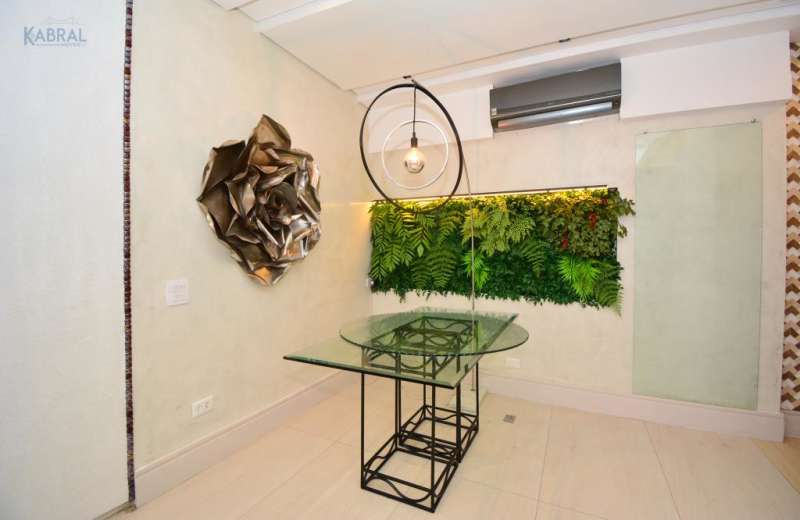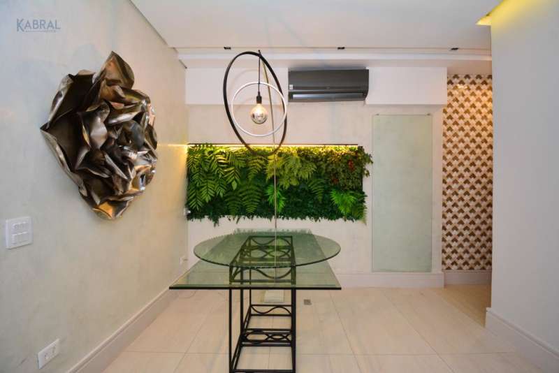 Os acabamentos são um grande diferencial: piso em porcelanato amadeirado de grandes dimensões, paredes com efeito marmorato, jardim com plantas preservadas e lavabo com revestimento sofisticado em papel mica.